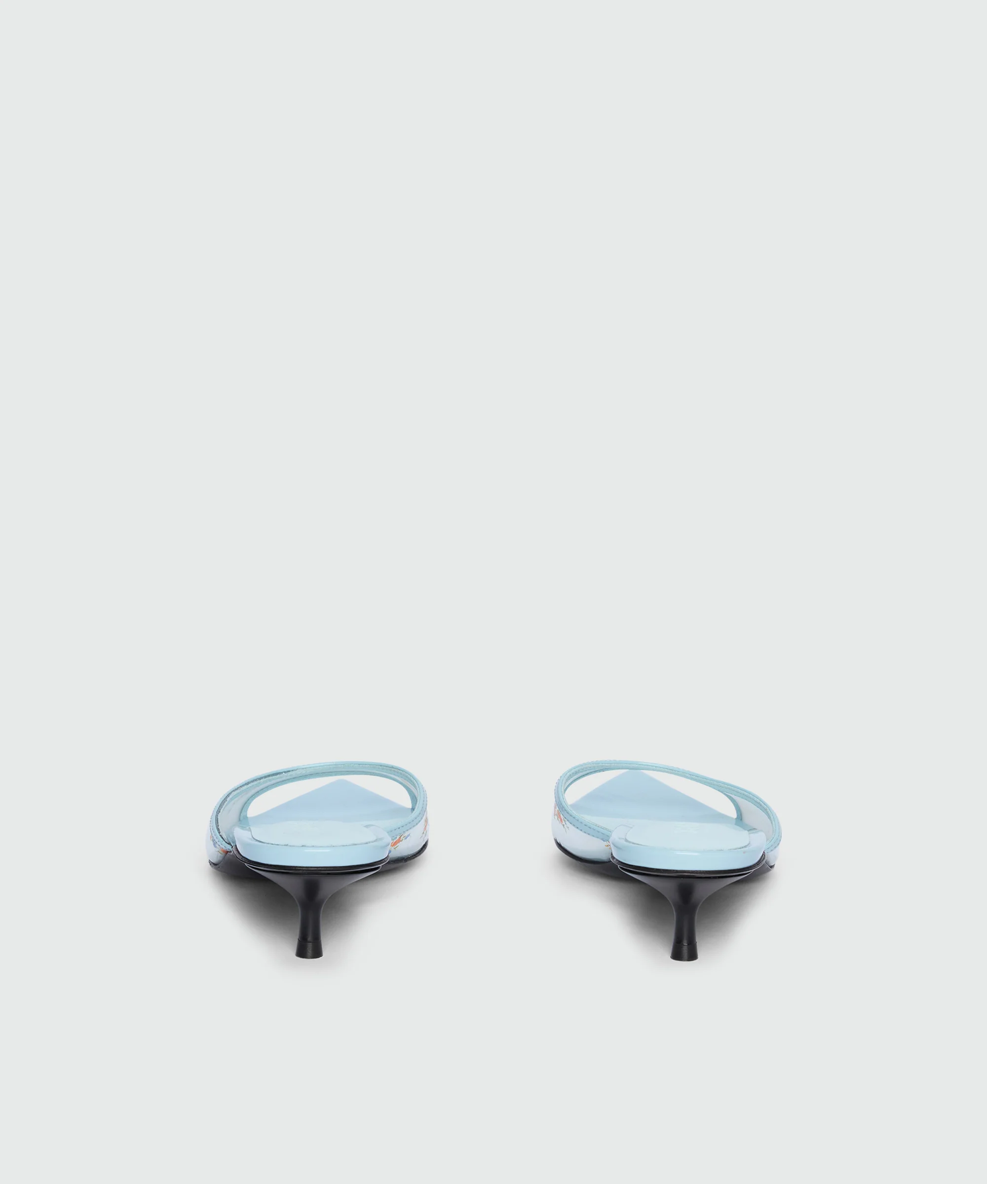 Printed TPU sandals with front straps and toe-post design, featuring a slim kitten heel and pointed toe.